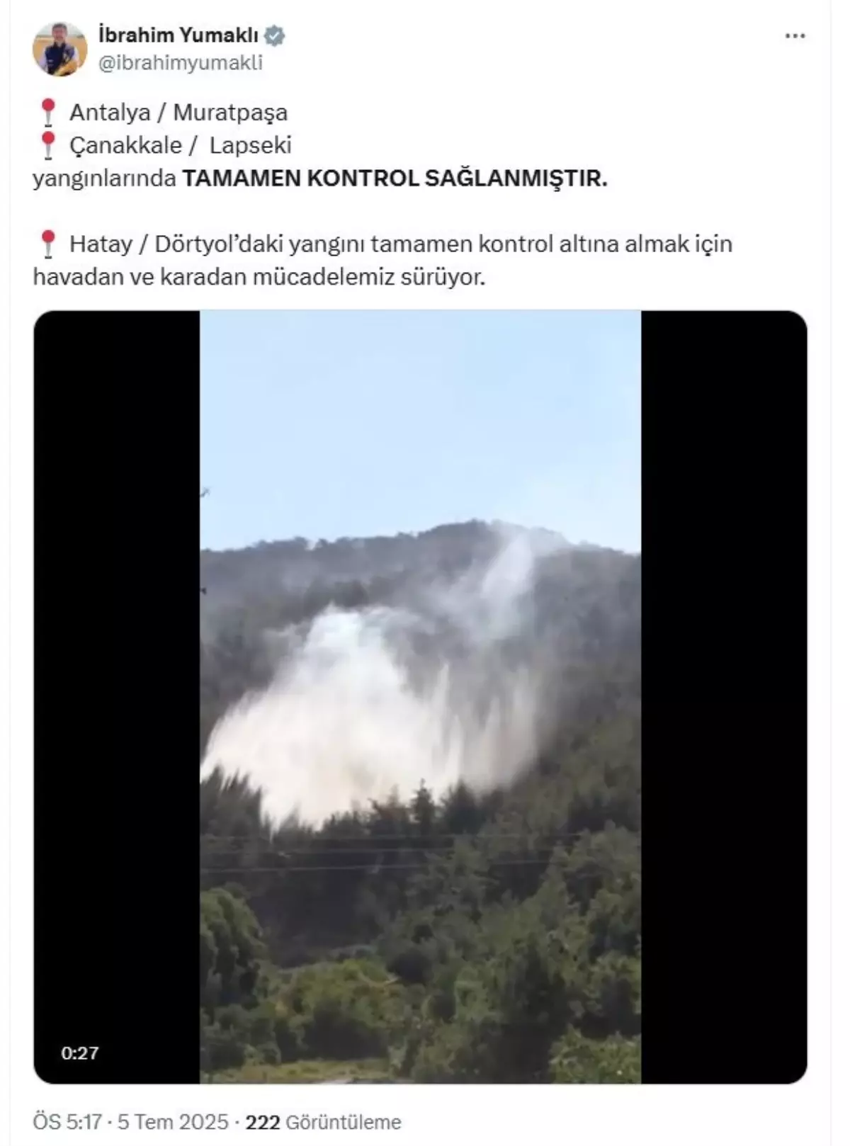 Tarım Ve Orman Bakanı İbrahim Yumaklı, sosyal medya hesabından yaptığı açıklamada, “Antalya Muratpaşa, Çanakkale Lapseki yangınlarında büsbütün denetim sağlanmıştır. Hatay Dörtyol’daki yangını büsbütün denetim altına almak için havadan ve karadan çabamız sürüyor” dedi.