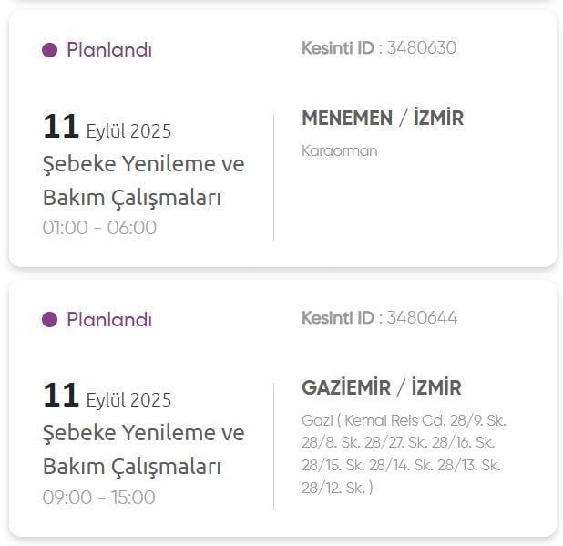 İzmir elektrik kesintisi ve GEDİZ elektrik kesintisi listesi araştırmaları yapılıyor. GDZ Elektrik Dağıtım şirketinden yapılan açıklamaya nazaran 11 Eylül günü İzmir’in çeşitli ilçelerinde farklı müddetlerde elektrik kesintileri yaşanacak. İşte İzmir’de elektrik kesintisi yaşanacak ilçeler ve İzmir’de elektrik kesintisi yaşanacak mahalleler! İzmir’de hangi ilçelerde elektrik kesilecek, İzmir’e elektrik ne vakit gelecek? İşte ayrıntılar haberimizde!