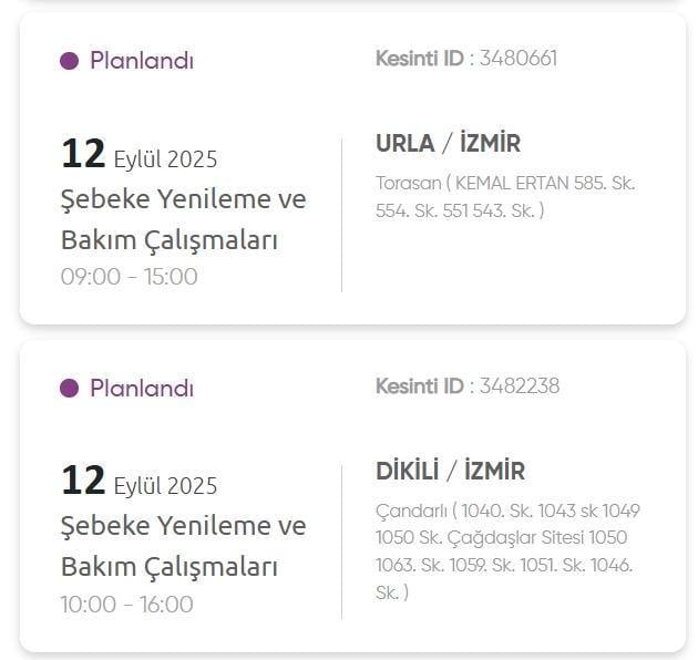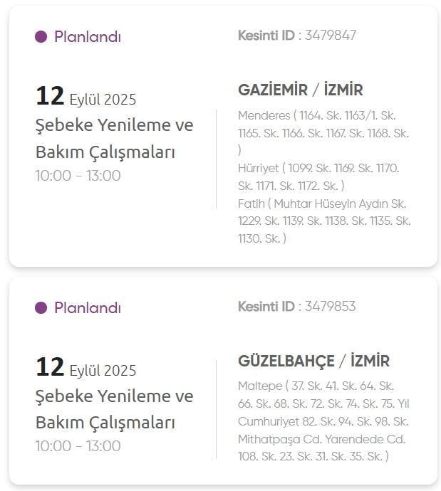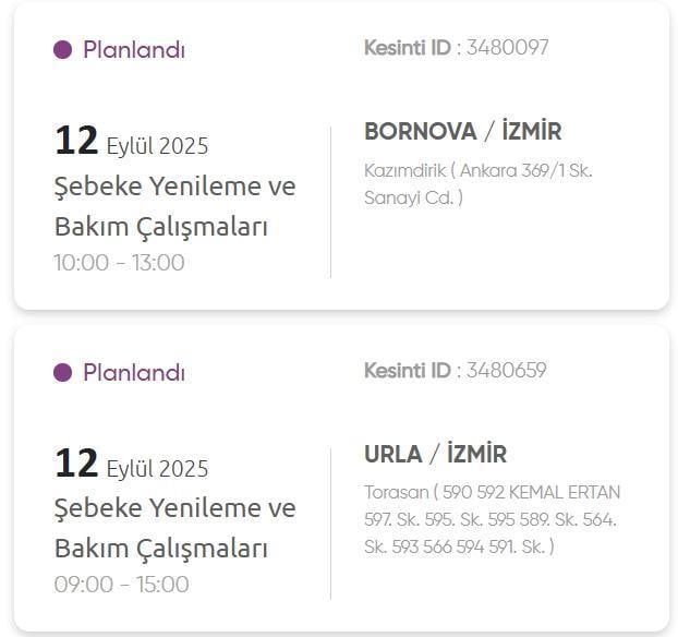 İzmir elektrik kesintisi ve GEDİZ elektrik kesintisi listesi araştırmaları yapılıyor. GDZ Elektrik Dağıtım şirketinden yapılan açıklamaya nazaran 12 Eylül günü İzmir’in çeşitli ilçelerinde farklı müddetlerde elektrik kesintileri yaşanacak. İşte İzmir’de elektrik kesintisi yaşanacak ilçeler ve İzmir’de elektrik kesintisi yaşanacak mahalleler! İzmir’de hangi ilçelerde elektrik kesilecek, İzmir’e elektrik ne vakit gelecek? İşte ayrıntılar haberimizde!