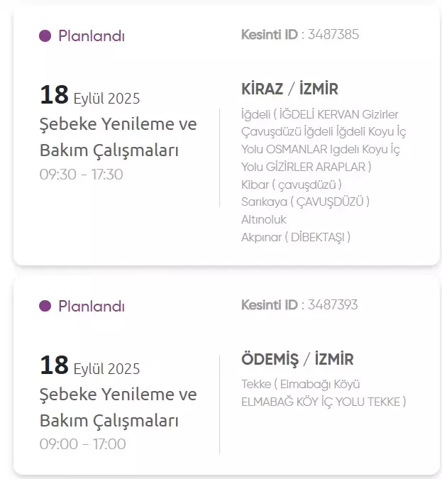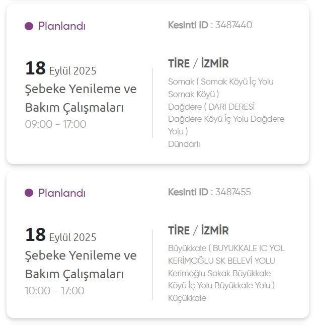 İzmir elektrik kesintisi ve GEDİZ elektrik kesintisi listesi araştırmaları yapılıyor. GDZ Elektrik Dağıtım şirketinden yapılan açıklamaya nazaran 18 Eylül günü İzmir’in çeşitli ilçelerinde farklı müddetlerde elektrik kesintileri yaşanacak. İşte İzmir’de elektrik kesintisi yaşanacak ilçeler ve İzmir’de elektrik kesintisi yaşanacak mahalleler! İzmir’de hangi ilçelerde elektrik kesilecek, İzmir’e elektrik ne vakit gelecek? İşte ayrıntılar haberimizde!