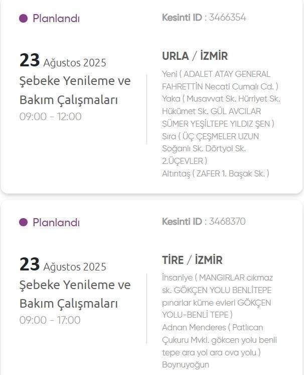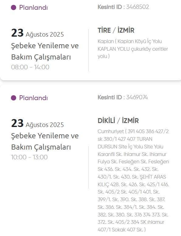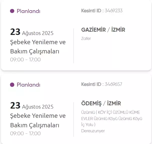 İzmir elektrik kesintisi ve GEDİZ elektrik kesintisi listesi araştırmaları yapılıyor. GDZ Elektrik Dağıtım şirketinden yapılan açıklamaya nazaran 23 Ağustos günü İzmir’in çeşitli ilçelerinde farklı müddetlerde elektrik kesintileri yaşanacak. İşte İzmir’de elektrik kesintisi yaşanacak ilçeler ve İzmir’de elektrik kesintisi yaşanacak mahalleler! İzmir’de hangi ilçelerde elektrik kesilecek, İzmir’e elektrik ne vakit gelecek? İşte ayrıntılar haberimizde!