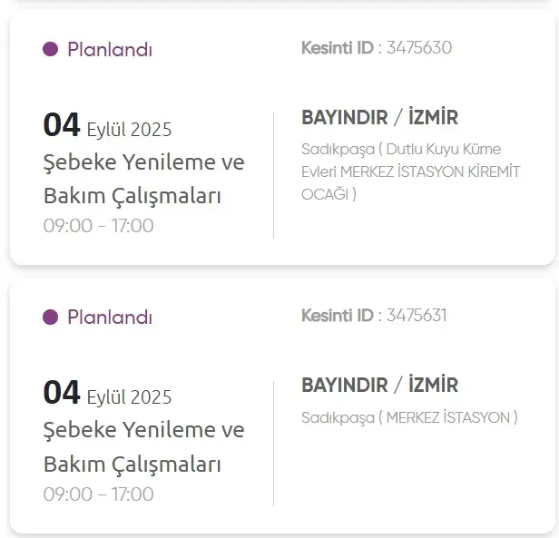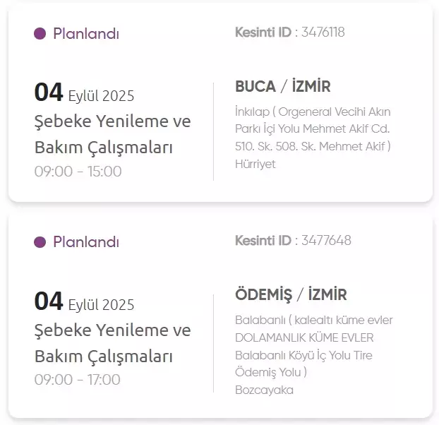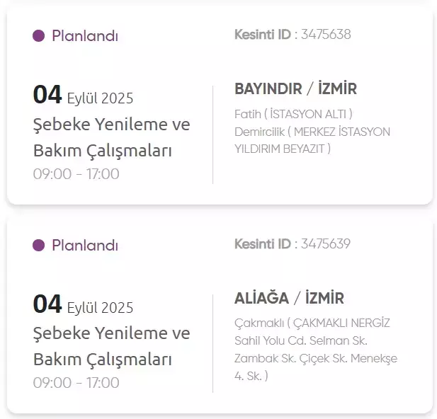 İzmir elektrik kesintisi ve GEDİZ elektrik kesintisi listesi araştırmaları yapılıyor. GDZ Elektrik Dağıtım şirketinden yapılan açıklamaya nazaran 4 Eylül günü İzmir’in çeşitli ilçelerinde farklı müddetlerde elektrik kesintileri yaşanacak. İşte İzmir’de elektrik kesintisi yaşanacak ilçeler ve İzmir’de elektrik kesintisi yaşanacak mahalleler! İzmir’de hangi ilçelerde elektrik kesilecek, İzmir’e elektrik ne vakit gelecek? İşte ayrıntılar haberimizde!