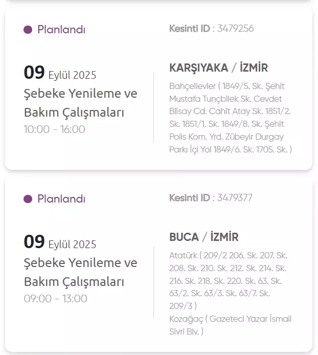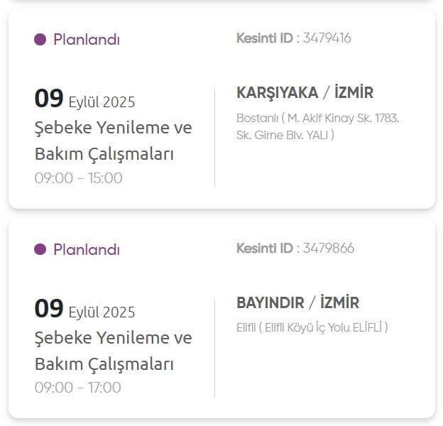 İzmir elektrik kesintisi ve GEDİZ elektrik kesintisi listesi araştırmaları yapılıyor. GDZ Elektrik Dağıtım şirketinden yapılan açıklamaya nazaran 9 Eylül günü İzmir’in çeşitli ilçelerinde farklı müddetlerde elektrik kesintileri yaşanacak. İşte İzmir’de elektrik kesintisi yaşanacak ilçeler ve İzmir’de elektrik kesintisi yaşanacak mahalleler! İzmir’de hangi ilçelerde elektrik kesilecek, İzmir’e elektrik ne vakit gelecek? İşte ayrıntılar haberimizde!