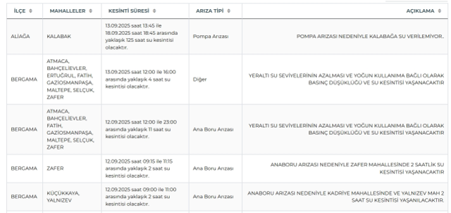 İzmir’de su kesinti yaşanacak ilçe ve mahalleler kesinti müddeti ile nedenlerine nazaran şu biçimdedir: