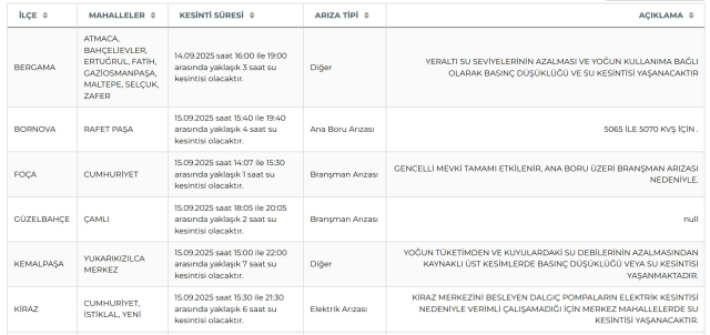 İzmir’de su kesinti yaşanacak ilçe ve mahalleler kesinti müddeti ile nedenlerine nazaran şu haldedir:
