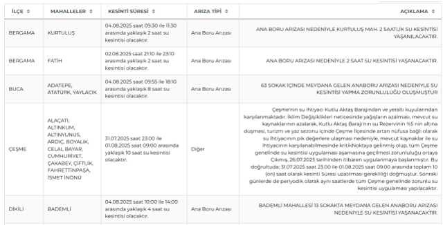 İzmir’de su kesinti yaşanacak ilçe ve mahalleler kesinti mühleti ile nedenlerine nazaran şu formdadır:
