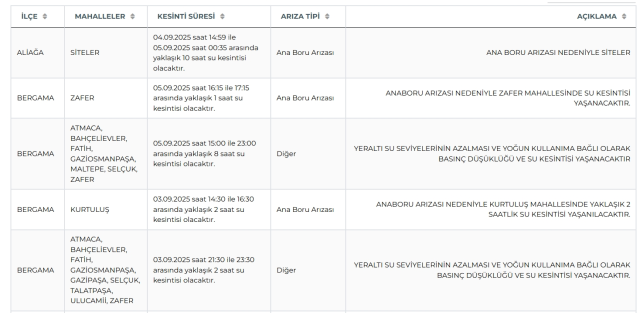 İzmir’de su kesinti yaşanacak ilçe ve mahalleler kesinti mühleti ile nedenlerine nazaran şu formdadır: