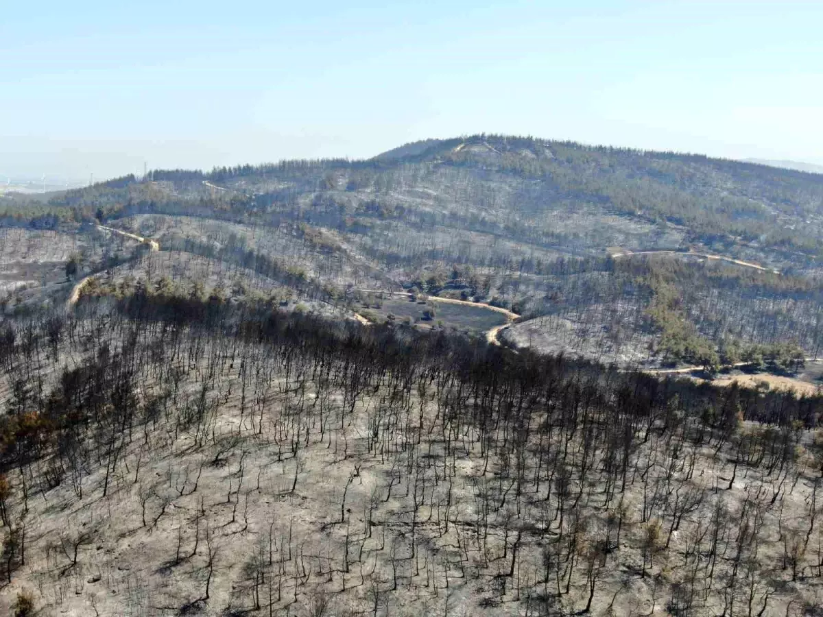 Dün öğlen saatlerinde başlayan ve geniş bir alanı etkileyen orman yangınının verdiği hasar havadan da görüntülenirken takımların hasar tespit çalışmaları sürüyor. – İZMİR