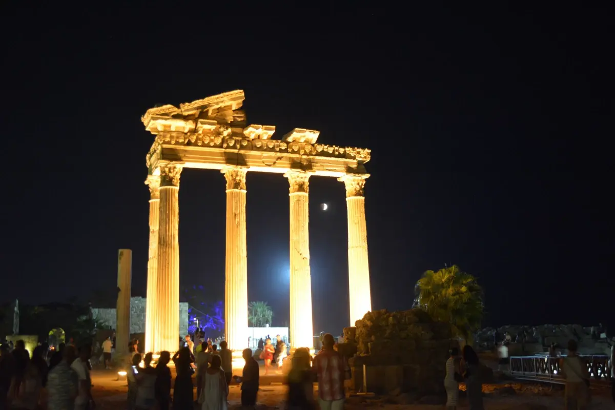 Manavgat’ın Side Mahallesi’nde bulunan ve antik periyodun izlerini taşıyan Apollon Tapınağı, gökyüzü olayını izlemek isteyenler için açık hava gözlemevine dönüştü. Dün gece gerçekleşen kanlı ay tutulması sırasında tapınağın etrafında toplanan turistler, bu eşsiz tabiat olayını cep telefonlarıyla görüntüledi. Turistler Side’nin tarihi atmosferinde bu türlü bir gökyüzü olayına tanıklık etmenin tecrübesini yaşadı.